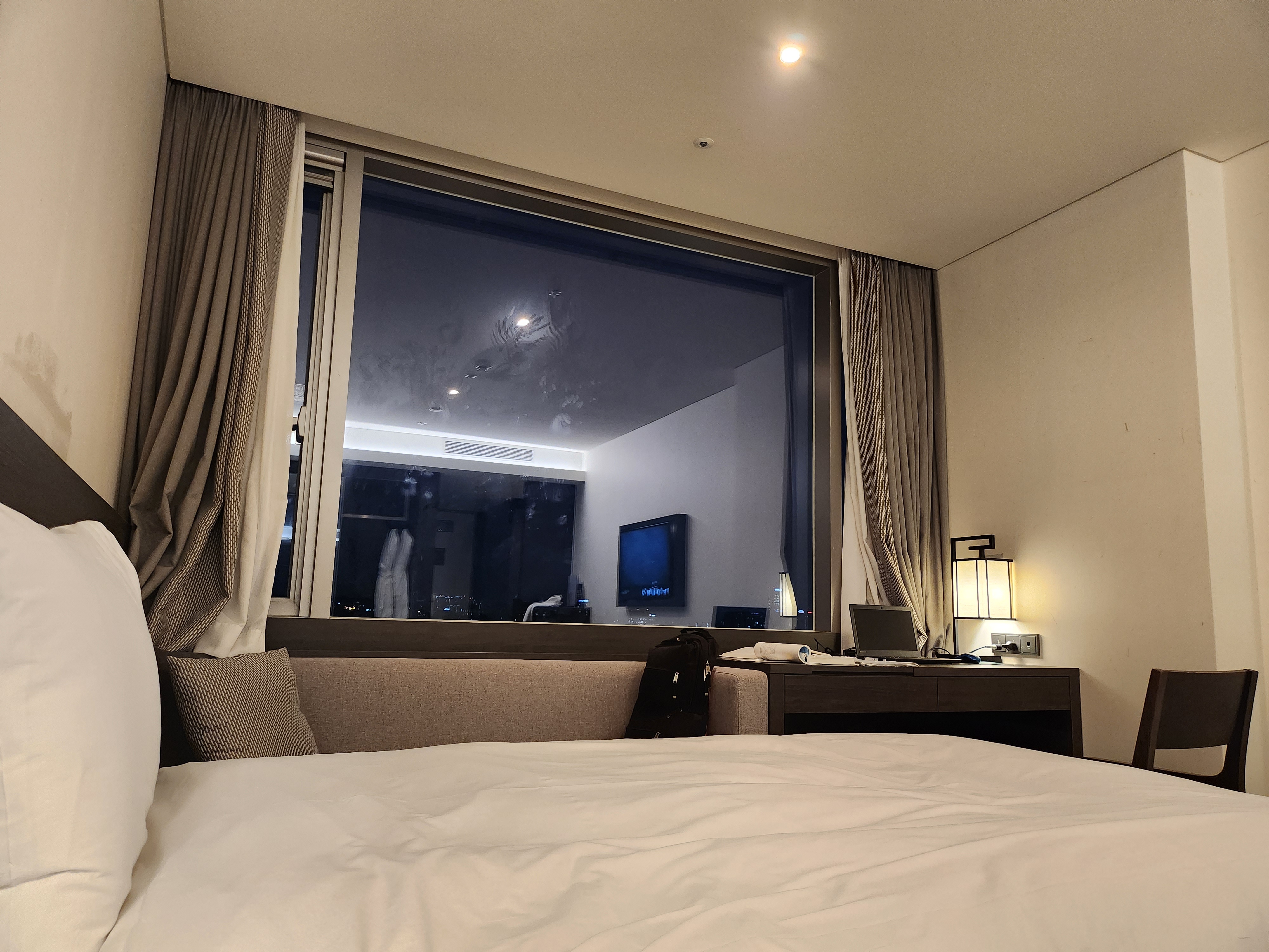 침대에서 창문을 찍어 봤어요. 외출하고 돌아와 밤에 찍은 사진이예요.