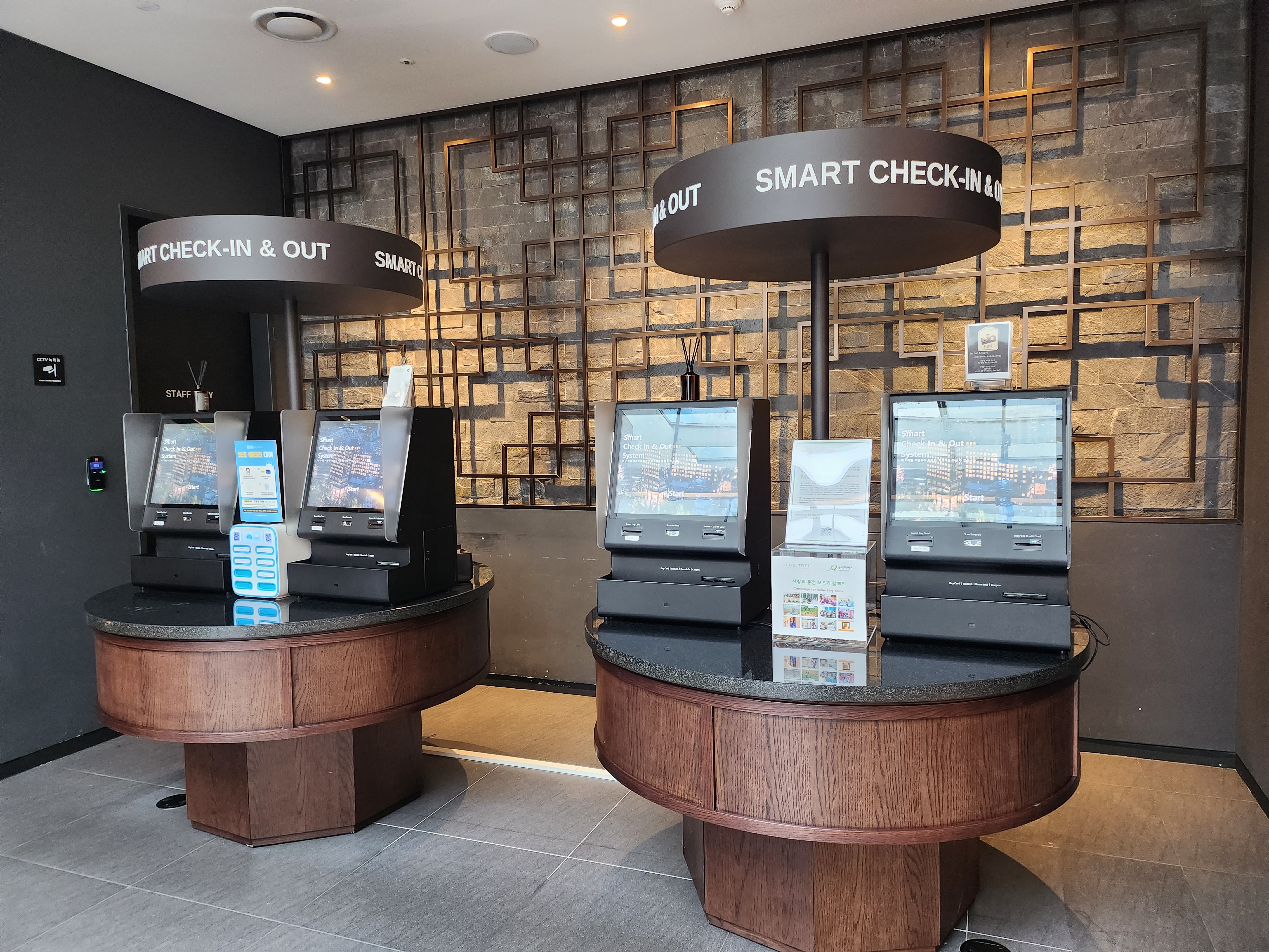 여기는 셀프체크인-체크아웃을 할 수 있는 곳이예요. 5층 로비에 있습니다.